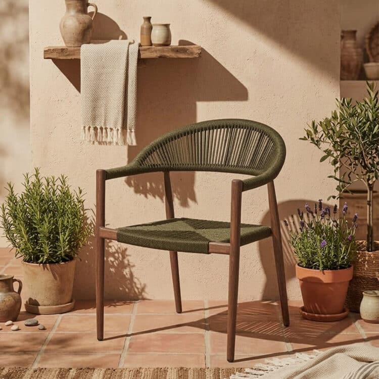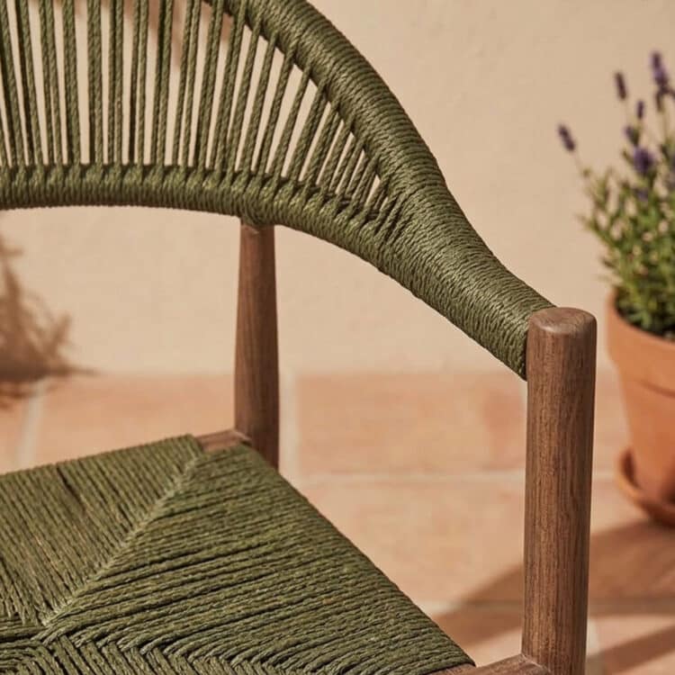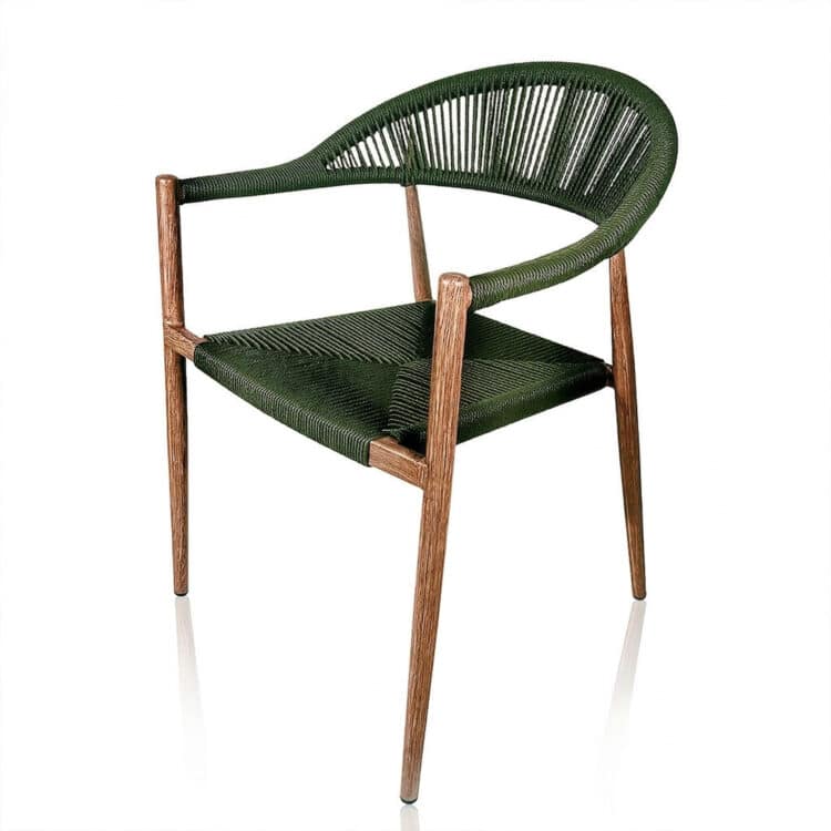 El Sillón Bistro Calma en cuerda verde con estructura efecto madera natural es una pieza pensada para terrazas de bares y restaurantes que buscan un estilo fresco y orgánico. Su diseño envolvente de líneas curvas aporta comodidad y personalidad, integrándose fácilmente en ambientes mediterráneos y espacios con estética natural.