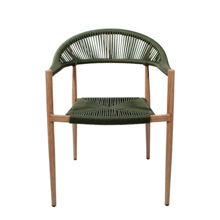 Fabricado con estructura de aluminio con acabado imitación madera, combina la calidez visual de la madera con la resistencia y ligereza del metal. El asiento y respaldo están realizados en cuerda sintética trenzada, creando un atractivo dibujo geométrico que aporta textura y carácter.